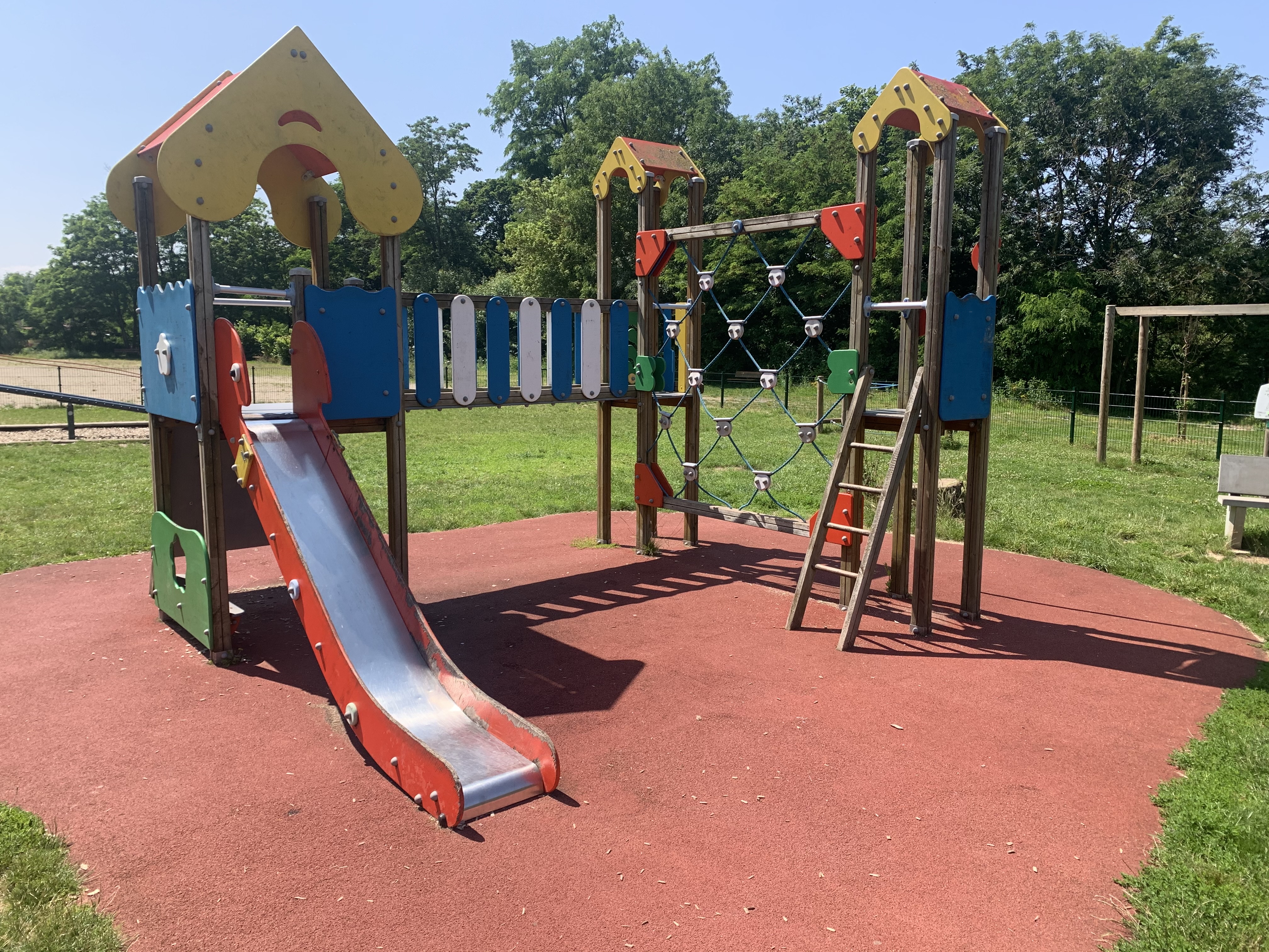 Bon aire de jeux pour les enfants, isolé de la route et bien équipé.