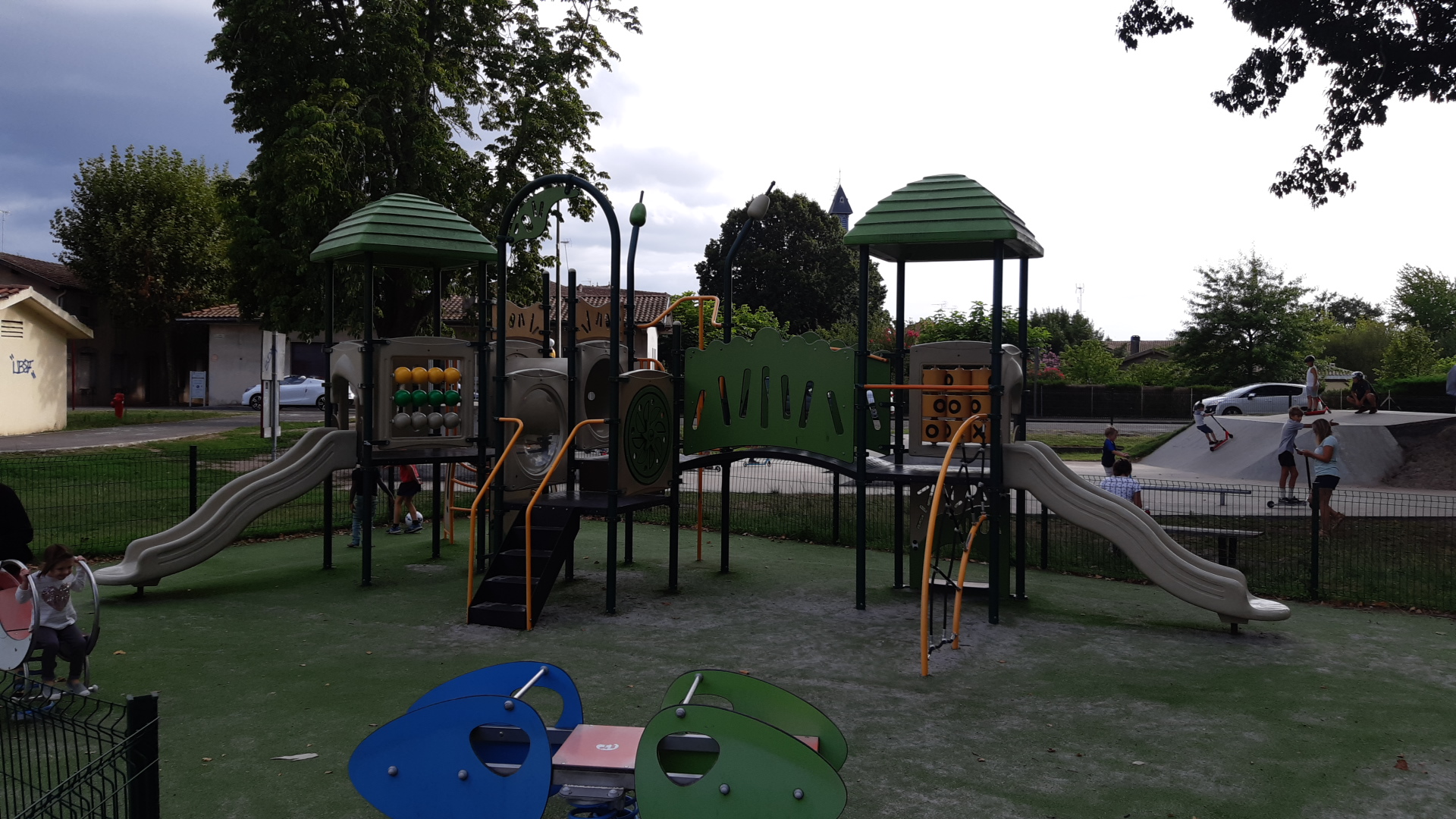 Y en a pour tous les âges ! Les tours petits, les petits, les moyens et les ados.. Divers toboggans, balançoires mis à disposition.. Une jolie structure pour s'amuser,arpenter, réfléchir,se balancer... Une araignée pour grimper...et à côté un skate park pour les ados et moyens aussi... Seul bémol...pas de sanitaires et manque d'ombrage sur la zone de jeux pour les petits...et skate park également... Lorsque le soleil est de sortie et qu'il tape fort...les équipements sont bouillants donc risque de brûlure pour les enfants et parents... Endroit sécurisé et propre. Environnement agréable où il y a deux tables pique nique et quelques bancs. Dommage que quelques fois, l'endroit soit envahi par des jeunes irrespectueux et irresponsables envers ces jeunes enfants...