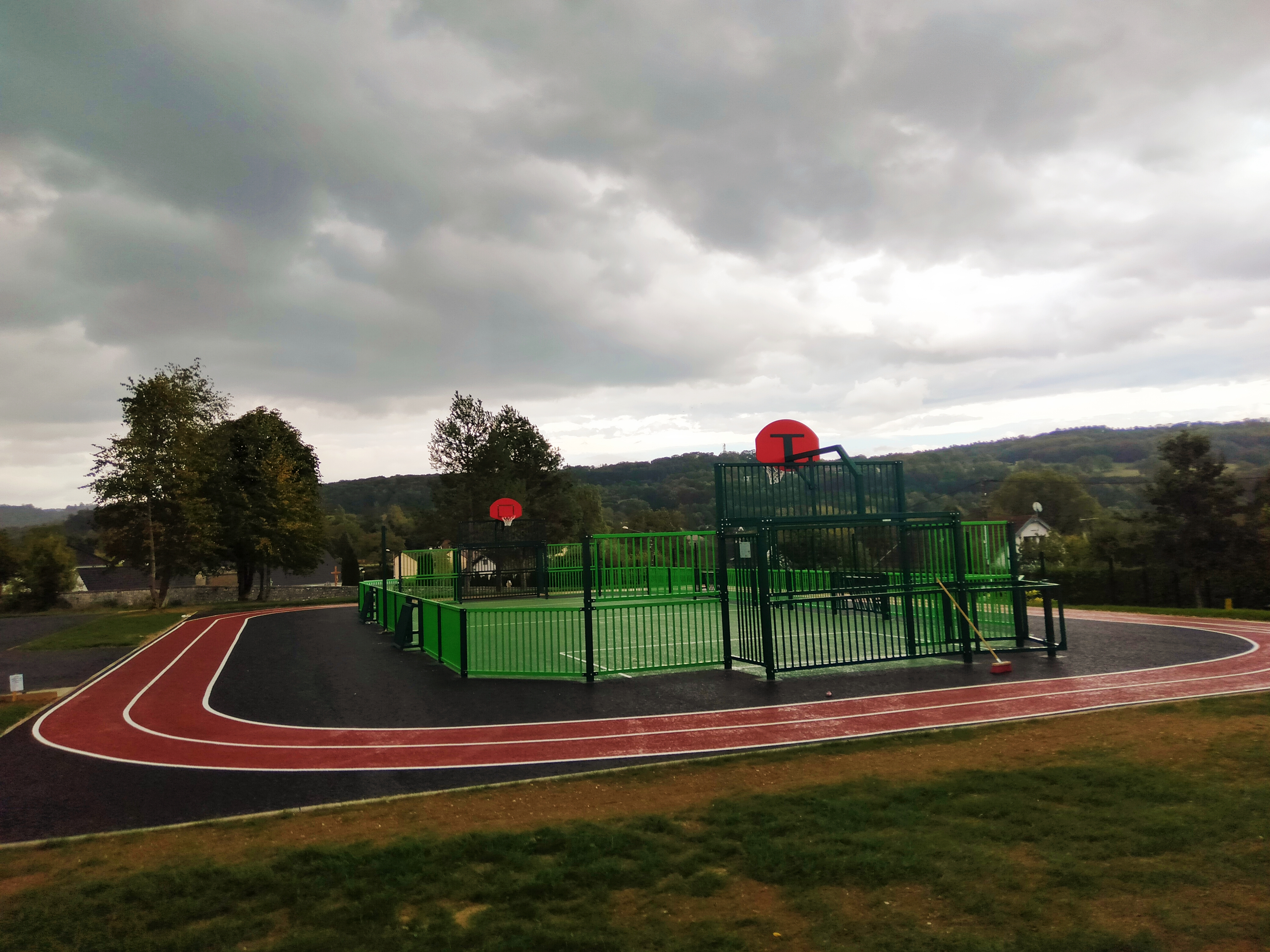 C'est un terrain de jeux pour enfants et adolescents qui vient d'être créé dans un très grand espace !! Tout est représenté : stadium 🥅 multifonctionnel, foot, ........, des agrès de remise en forme,🏋️ balançoires, pyramide de cordages🪢, rocher d'escalade,🪨 table de ping-pong 🏓, et surtout...... une jolie petite tyrolienne !! Vraiment de quoi 😂 s'amuser...... très bien !! ✨